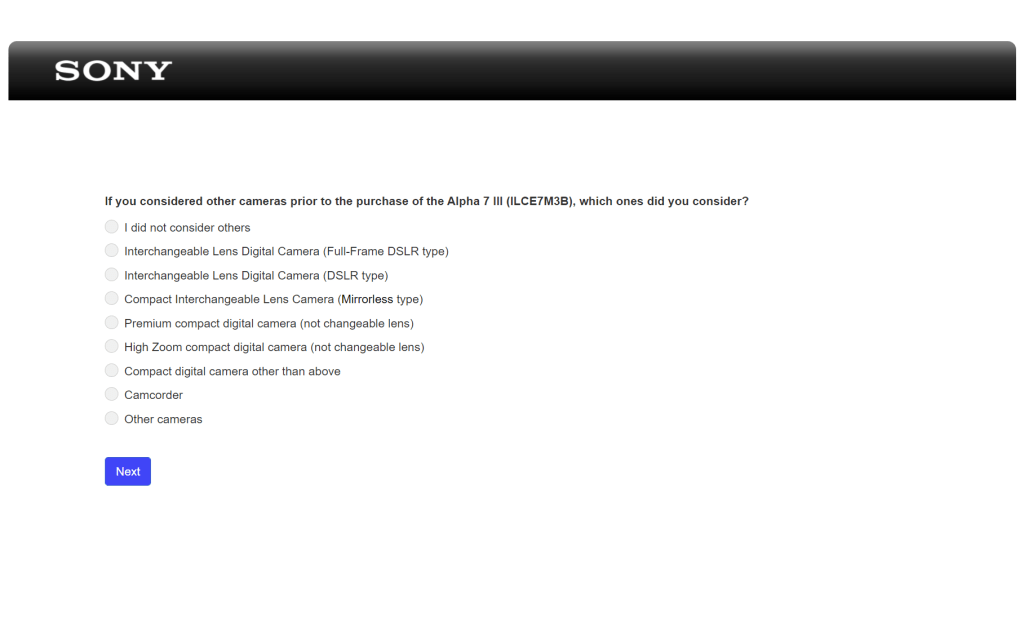 Okay, so you notice anything missing here? No option for an integrated grip or larger sized camera? What about grip ergonomics, an issue constantly raised about Sony cameras? Nothing about that. The problem is if you select none of the above, it takes you to the next question, there isn’t an option to add things they missed.